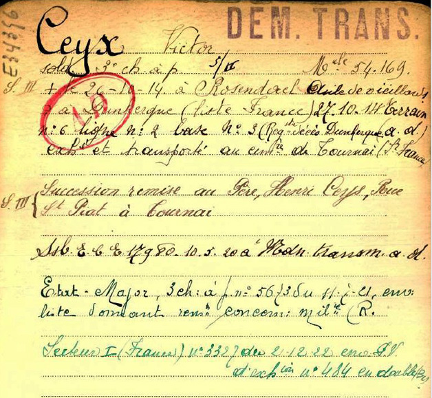 Blessé, Victor Ceyx est admis le 24 Octobre 1914 à l’Hôpital militaire de Rosendael et il décède le 26 Octobre à 7h00 du matin.