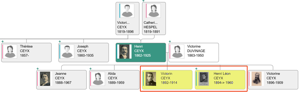– Victor CEYX, né à Tournai vers 1892. Je n’ai pas de photo de même type mais je vous joins une photo de famille. Je savais uniquement qu’il était mort à la guerre.